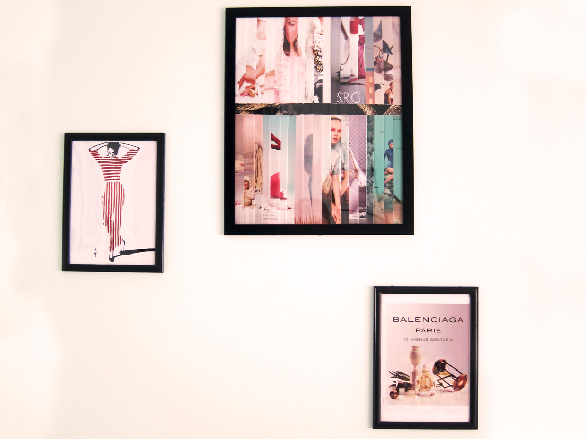 So, practicality be damned, I had to find my way through these limitations. Budget issues meaning I got my frames from places such as IKEA and Daiso. I also framed tear sheets from magazines or created my own poster/art instead of buying for the bigger ones. No holes meaning I compromised by using bluetacks to hang my wall arts. This poses another issue because bluetacks can only support so much and it has given way several times but I just have to live with it.